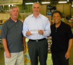 | Thomas Mantz, CEO of Feeding America Tampa Bay, holds a check presented to him by Neil Armstrong, right, & Scott McCance. |
