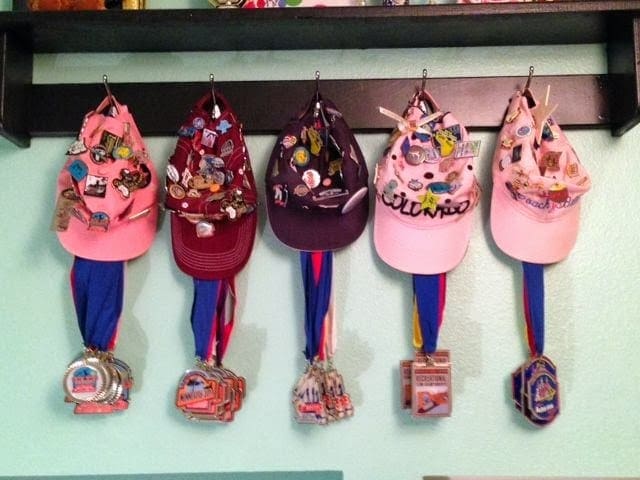 | Morgan has filled up five hats with pins from all over the world. She trades pins with friends she meets at the ISI world events. |